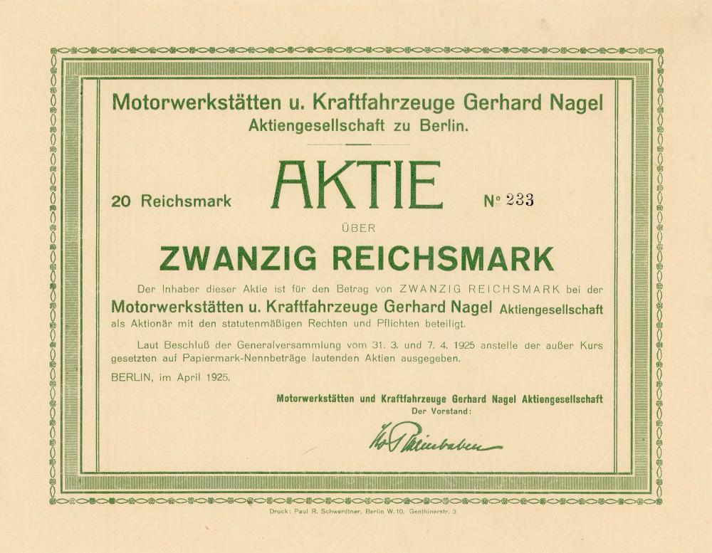 Fondata nel 1921. Gestione di officine per motori, fabbricazione di motori, commercio di automobili e aeromobili. Un’azienda importante, esistevano filiali a Rostock, Breslavia, Warmbrunn, Landshut, Ratibor, Gleiwitz e Hirschberg.