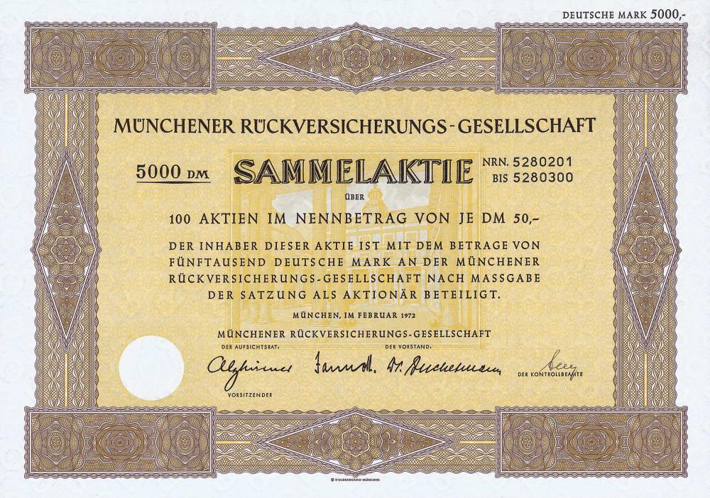 Munich Re fu fondata nel 1880, divenne pubblica nel 1888. Nel 1889/90, il suo co-iniziatore Carl Thieme fu uno dei fondatori di Allianz-Versicherung, che portò alla stretta integrazione di entrambe le società per oltre 100 anni. Un ufficio a Londra fu il primo passo all’estero nel 1890. Nel 1899 apertura di un ufficio negli Stati Uniti; Munich Re fu colpito duramente nel 1906 dal devastante terremoto di San Francisco. Fondamenti innovativi sono l’assicurazione europea per i bagagli da viaggio AG nel 1907, la prima riassicurazione per i rischi degli aerei nel 1910 e Hermes Kreditversicherungs-AG nel 1917. La posizione di Monaco viene messa in discussione nel 1911 dopo un drastico aumento delle tasse in Baviera, ma non per molto: nel 1913, Munich Re si trasferisce nella sua magnifica nuova sede in Königinstrasse, che esiste ancora oggi. Dopo la prima guerra mondiale, le attività statunitensi furono liquidate dalle autorità statunitensi e le attività dovettero essere completamente cancellate. Nel 1996, Munich Re iniziò di nuovo con l’acquisto di American Re negli Stati Uniti. Per la terza volta solo sfortuna negli Stati Uniti, la nuova entrata si rivela una tomba da un miliardo di dollari. Nel 1997, Munich Re ha raggruppato i suoi principali assicuratori sotto l’egida di ERGO. Nel 1998, l’attività di gestione patrimoniale era concentrata presso MEAG. Oggi il più grande riassicuratore al mondo con 200 filiali in 160 paesi.