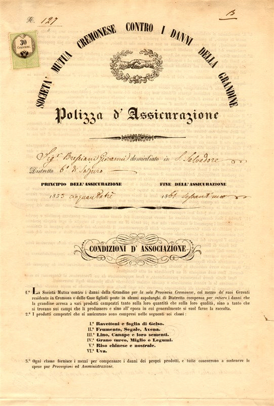 Polizza stampata e manoscritta su carta filigranata in doppio foglio per assicurare dai danni causati dalla grandine i prodotti coltivati nei campi, di proprietà dell’intestatario, siti nel distretto di Sospiro, Comune di Pugnolo, nella provincia cremonese. Agenzia di Cremona, all’epoca nel Regno Lombardo-Veneto, 6 giugno 1853. In testa al documento e nel timbro a inchiostro della compagnia, sul secondo foglio, spicca la simbolica stretta di mano, ispirata al concetto di cooperazione. Marca da bollo di 30 Centesimi del Regno Lombardo-Veneto.