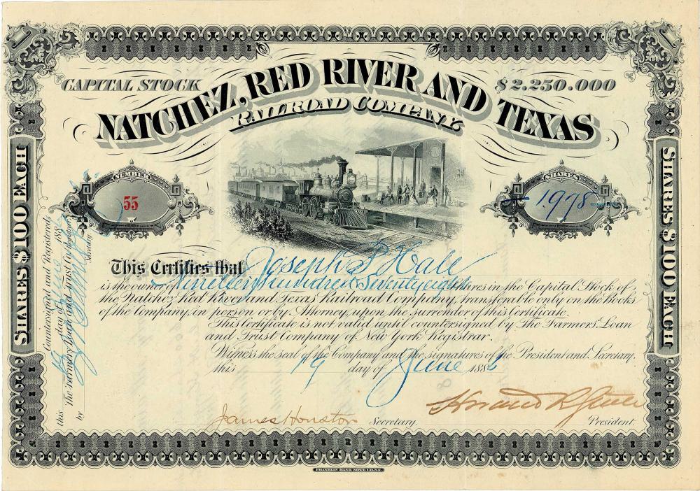 Fondata nel 1881 per acquistare Vidalia & Western RR (prezzo di acquisto di $ 60.000), che gestiva una ferrovia a scartamento ridotto dalla stazione di Black River (di fronte a Trinity) a Vidalia, La. sul Mississippi (di fronte a Natchez). La nuova società ha progettato una ferrovia lunga 160 miglia da Vidalia, La. al fiume Sabine in Texas, che fu effettivamente costruita ed era in funzione dall’aprile 1886 con due locomotive a vapore, 3 passeggeri e 25 vagoni merci. Nel 1897 venne riorganizzata come Natchez e Western Ry., nel 1905 si fuse con St. Louis, Iron Mountain & Southern (e quindi con il potente sistema MoPac).