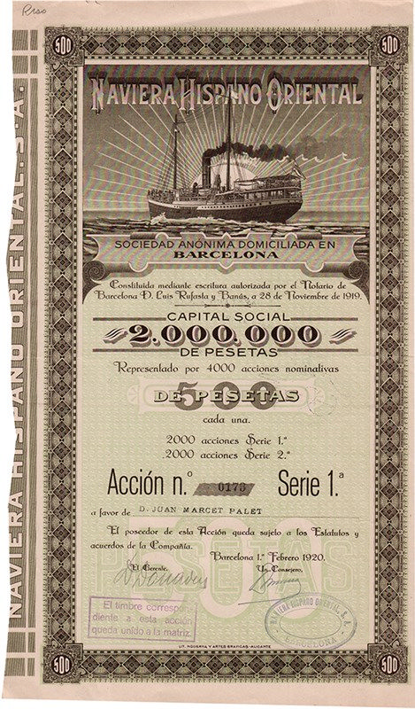 Bella immagine di un bastimento a vapore e a vela in navigazione sullo sfondo di un simbolico sole nascente. La compagnia fu creata nel 1919 per esercitare una rotta tra la Spagna e l’Africa settentrionale.