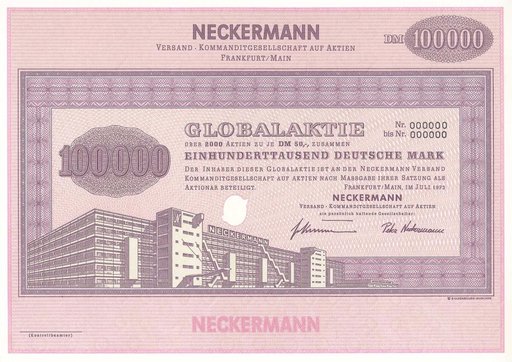 Fondata nel 1948 come azienda tessile Neckermann KG, nel 1963 riorganizzata in KGaA. Nello stesso anno iniziano le vendite di case prefabbricate e il servizio di viaggi (in seguito Neckermann e Reisen N-U-R). Nel 1976 Karstadt AG ha acquisito una partecipazione nel box, nel 1977 la società gravemente danneggiata è stata rinnovata, nel 1984 è stata integrata nella Karstadt AG. Ciò che rimane è il successo imprenditoriale senza precedenti di Josef Neckermann, che deteneva una quota di mercato del 10% nella sola attività di vendita per corrispondenza tedesca.