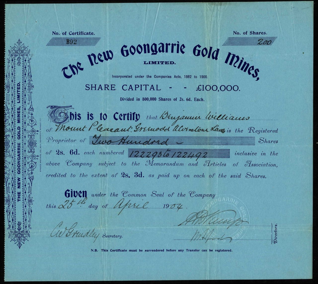 Capitale £ 100.000 in azioni di 2 / 6d.