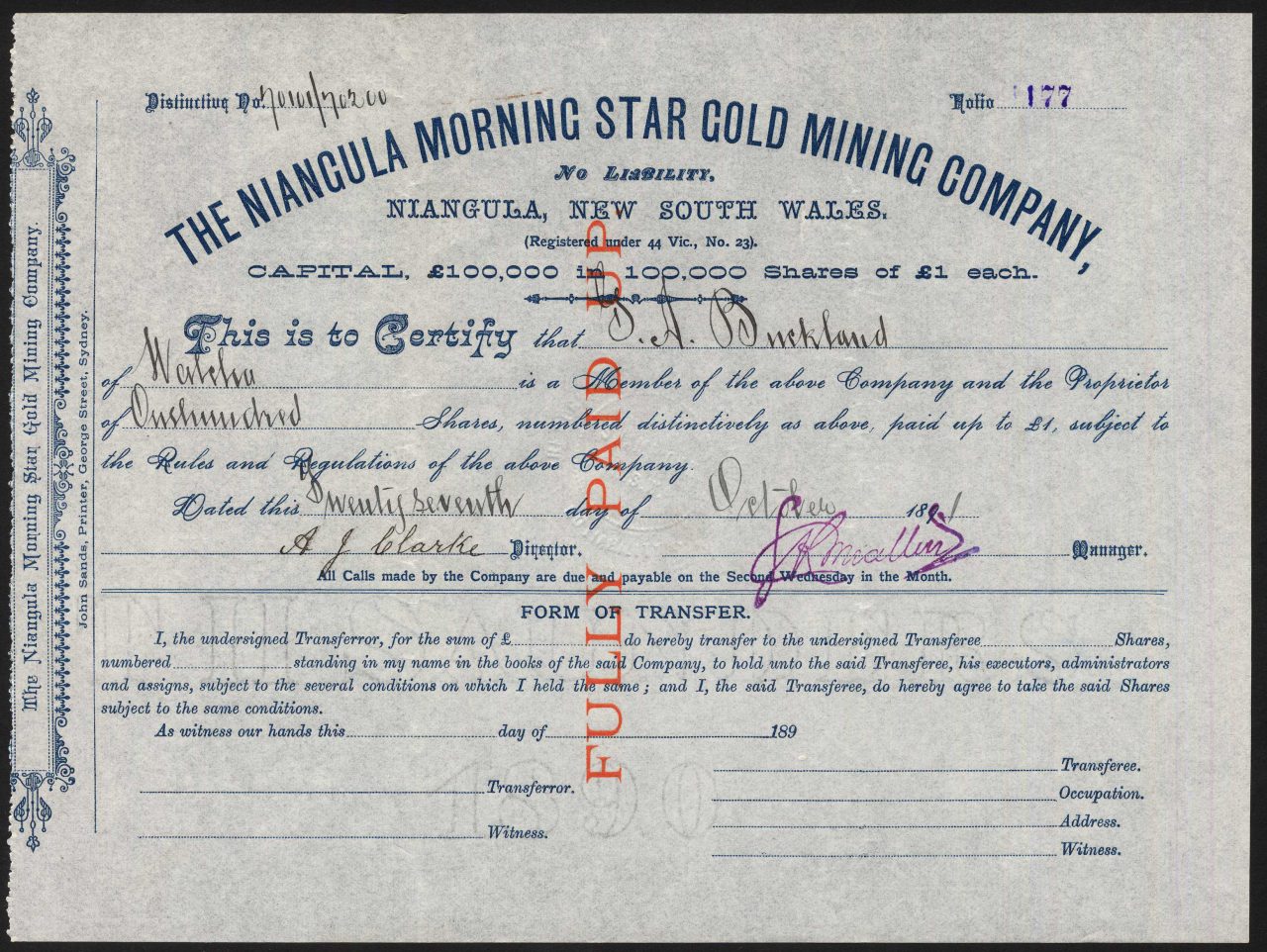 A-32654Niangula Morning Star Gold Mining Company NL-1Nuovo Galles del Sud1891£1 SharesR2 (1001-5000 pezzi)S2 (da 26 a 50 €)