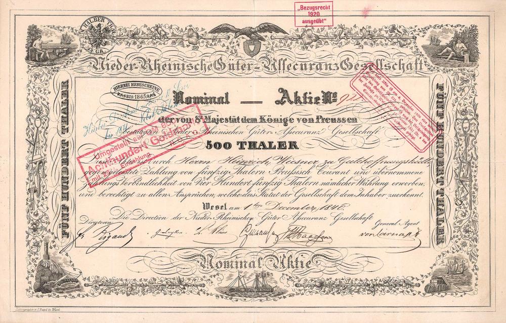 Fondata nel 1839 per fornire un’assicurazione contro i pericoli del trasporto terrestre e marittimo, compreso lo stoccaggio. Gli azionisti erano noti uomini d’affari della pianura del Basso Reno, che desideravano una copertura assicurativa per i loro trasporti di merci sul Reno, tra cui la famiglia Haniel. L’attività di riassicurazione fu affidata nel 1854 a un’associazione di riassicurazione, che divenne legalmente indipendente solo nel 1913 come “Vesalia” Versicherungs-AG. Dopo la fine del XX secolo, ha lavorato come assicuratore primario nel settore delle assicurazioni sui trasporti, incendio e furto con scasso. Nel 1924/25 si verificarono grosse perdite nell’assicurazione collettiva appena iniziata e il Reich Insurance Office chiese allora un aumento di capitale. L’Organismo di Vigilanza ha appreso della situazione solo quando gli è stata richiesta una garanzia per l’aumento di capitale, che ha rifiutato. La nuova attività fu poi ceduta alla Norddeutsche Versicherungsgesellschaft, il fallimento fu aperto alla fine di marzo 1926. Poiché le azioni sono state pagate solo fino al 25%, l’amministratore del fallimento ha chiesto il pagamento completo. La maggior parte degli azionisti, in particolare i membri di AR, ha rifiutato, facendo riferimento a bilanci errati e ha litigato su tutto fino al Reichsgericht, ma ha perso: vista la propria negligenza, l’AR difficilmente poteva prendere i bilanci come motivo per rifiutare il pagamento completo.