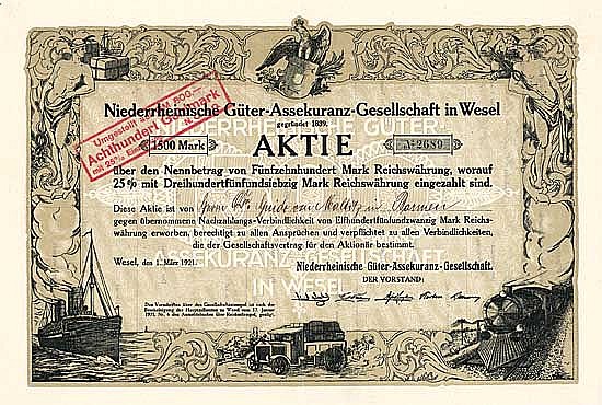 Fondata nel 1839 per fornire un’assicurazione contro i pericoli del trasporto terrestre e marittimo, compreso lo stoccaggio. Gli azionisti erano noti uomini d’affari della pianura del Basso Reno, che desideravano una copertura assicurativa per i loro trasporti di merci sul Reno, tra cui la famiglia Haniel. L’attività di riassicurazione fu affidata nel 1854 a un’associazione di riassicurazione, che divenne legalmente indipendente solo nel 1913 come “Vesalia” Versicherungs-AG. Dopo la fine del XX secolo, ha lavorato come assicuratore primario nel settore delle assicurazioni sui trasporti, incendio e furto con scasso. Nel 1924/25 la compagnia di assicurazioni collettive, appena avviata, subì grosse perdite e il Reich Insurance Office chiese allora un aumento di capitale. L’Organismo di Vigilanza ha appreso della situazione solo quando gli è stata richiesta una garanzia per l’aumento di capitale, che ha rifiutato. La nuova attività fu poi ceduta alla Norddeutsche Versicherungsgesellschaft, il fallimento fu aperto alla fine di marzo 1926. Poiché le azioni sono state pagate solo fino al 25%, l’amministratore del fallimento ha chiesto il pagamento completo. La maggior parte degli azionisti, in particolare i membri di AR, hanno rifiutato, riferendosi a bilanci errati e hanno litigato in tutti i casi fino al Reichsgericht, ma hanno perso soprattutto vista la propria negligenza nel loro esame.