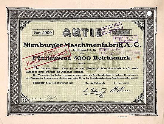A-67744Nienburger Maschinenfabrik AG-1Nienburg19231 azione da 5.000 Marchi--