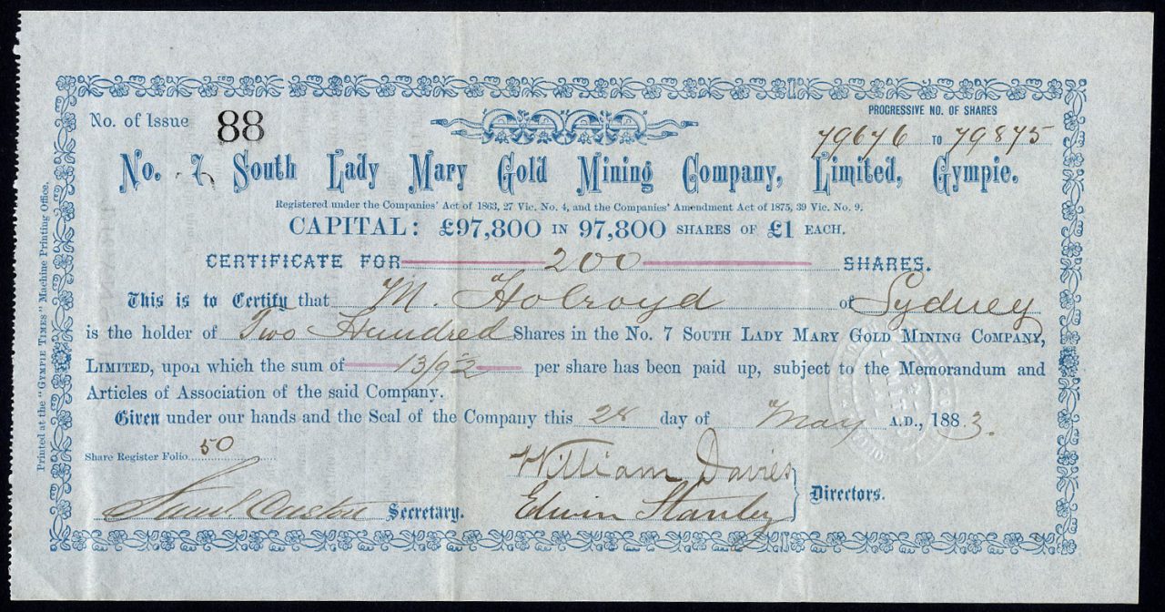 Registrato nel Queensland. Miniere a Gympie.