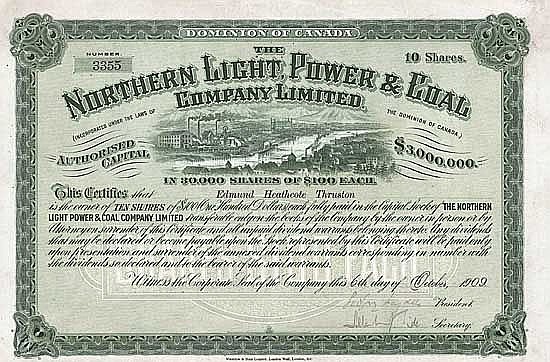 Fondata il 21 maggio 1909. Le vaste partecipazioni dell’azienda includevano: Dawson City Electric Light & Power Co., Yukon Telephone Syndicate, Dawson City Water & Power Co., miniere di carbone vicino a Dawson City, una segheria, una ferrovia lunga 11 miglia, ecc. L’azienda aveva sede a Dawson City, la famosa città della corsa all’oro nel territorio dello Yukon, nel Canada nord-occidentale, nell’area mineraria del Klondike. La città fu fondata solo nel 1896, aveva 30.000 abitanti nel 1898 e divenne nuovamente priva di significato con l’esaurimento dei depositi d’oro negli anni ’20 (oggi: meno di 1.000 abitanti).