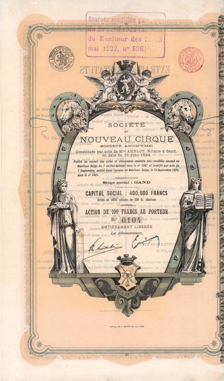 La Ges. Costruì un magnifico edificio a cupola per “spettacoli pubblici”, festival di cavalli e altri festival, concerti e mostre a Gand, Rue de l’Agneau 13. Per diversi decenni, il “Nouveau Cirque” è stato uno dei punti focali della vita sociale della città.