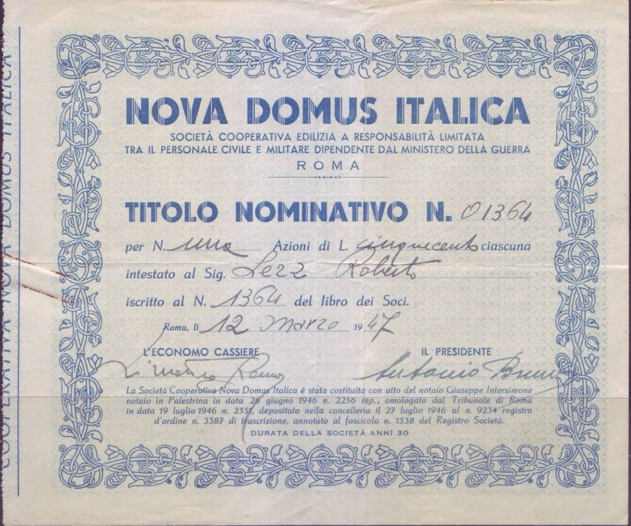A-84820Nova Domus Italica Soc. Coop edilizia tra personale civile e militare dip. min. guerra-1Roma19471 azione di lire 500R1 (Più di 5000 pezzi)S1 (da 0 a 25 €)