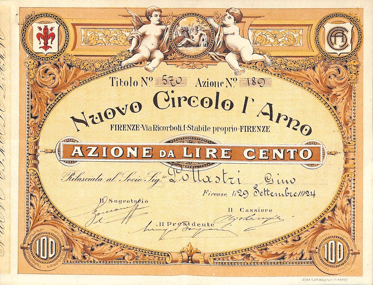 Ornato ovale decorativo con puttini che reggono l’emblema del circolo culturale fiorentino, rappresentato da Nettuno che mesce acqua da un’anfora. Giglio - simbolo del capoluogo toscano - e logo agli angoli superiori.