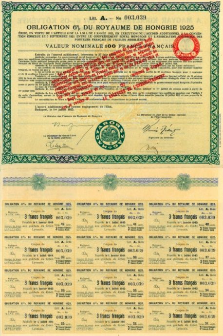 Titolo obbligazionario del valore di 100 Franchi Francesi.