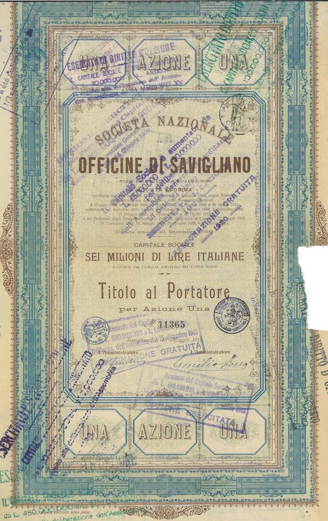 B-3666Nazionale delle Officine di Savigliano Soc.-2Tipografia Vincenzo Bona – TorinoCuneo19111 azione al portatore da Lire 500R2 (1001-5000 pezzi)S2 (da 26 a 50 €)