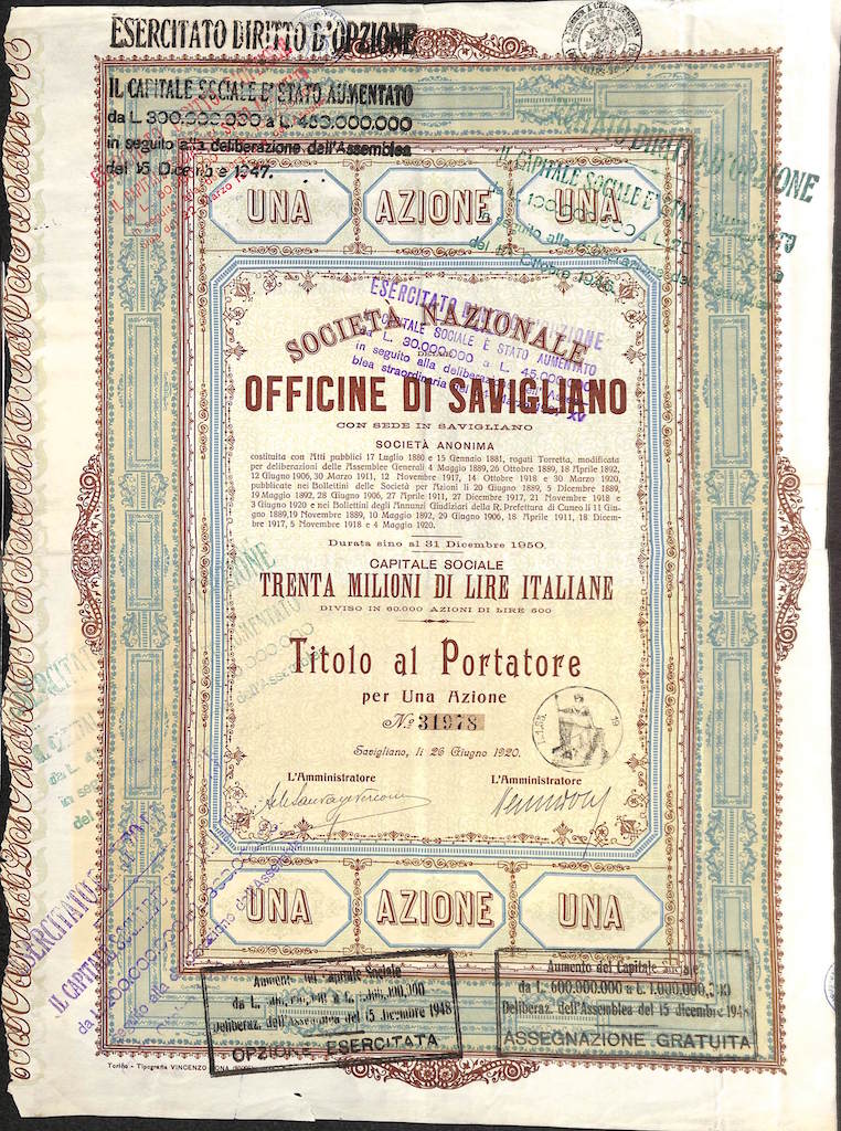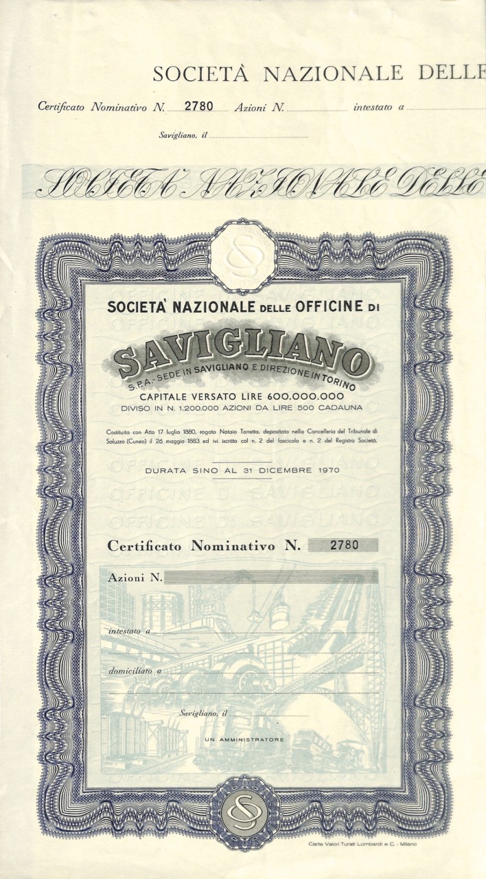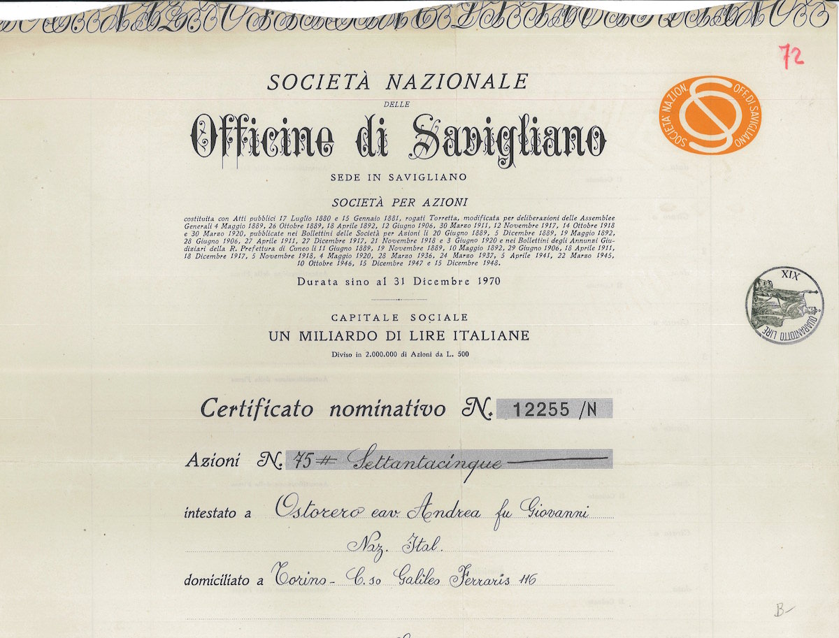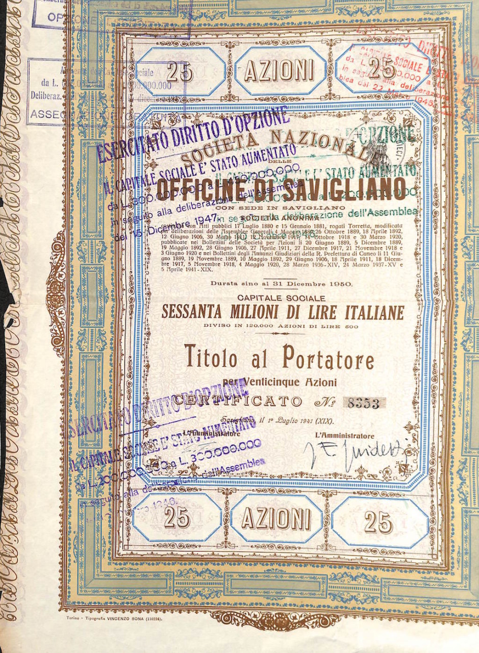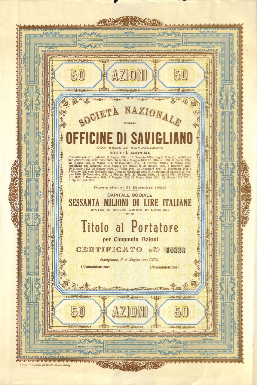 L-3666Nazionale delle Officine di Savigliano Soc.-12Tipografia Vincenzo Bona – TorinoCuneo194150 azioni al portatore da Lire 500R2 (1001-5000 pezzi)S2 (da 26 a 50 €)