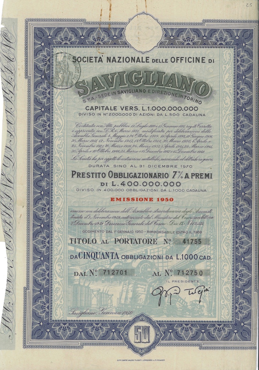 Z-3666Nazionale delle Officine di Savigliano Soc.-26Officina Carte Valori Turati Lombardi e C. - MilanoCuneo195050 obbligazioni 7% al portatore da Lire 1.000R2 (1001-5000 pezzi)S1 (da 0 a 25 €)
