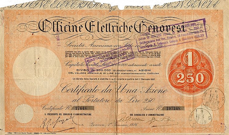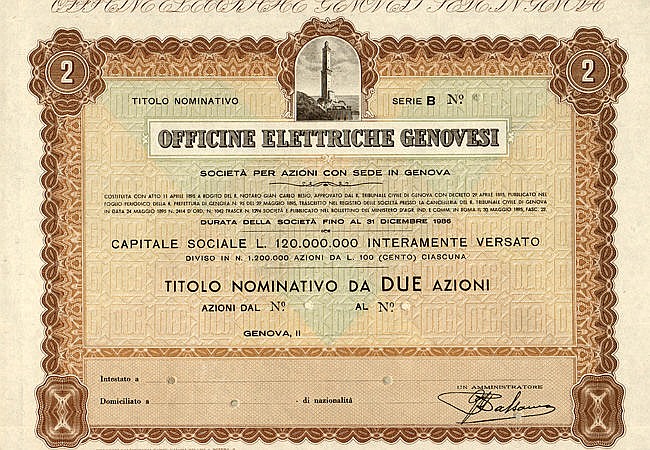 La società Officine elettriche genovesi OEG fu costituita a Genova l’11 aprile 1895 dalla AEG – Allgemeine Elektrizitäts Gesellschaft di Berlino, S.A. con rogito del notaio Besio, registrato in Genova il 22 luglio 1895. La costituzione avvenne dopo una dura lotta con la Siemens per il controllo della produzione e distribuzione di energia elettrica della città.