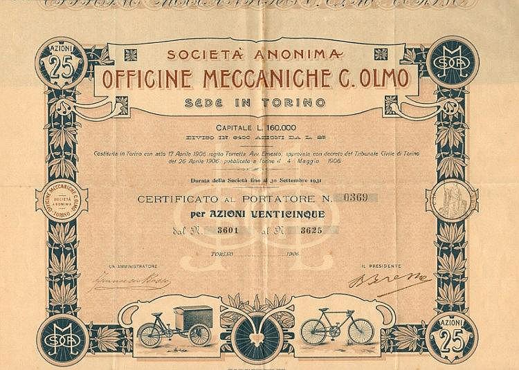Raffinata cornice di ispirazione Liberty con intreccio di rami, logotipi e simpatiche vignette di velocipedi di cui uno adibito al trasporto di merci.