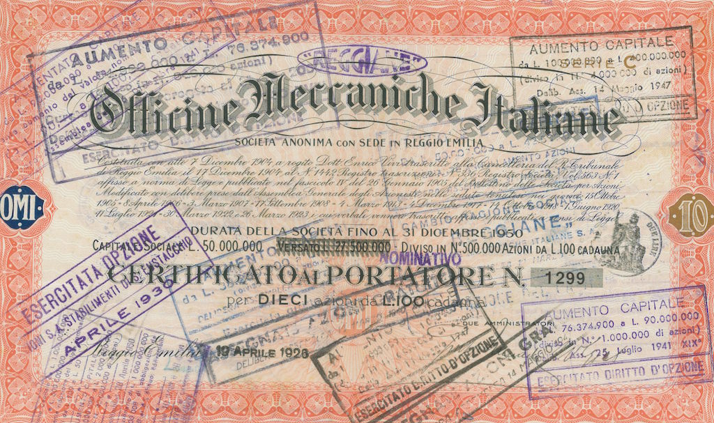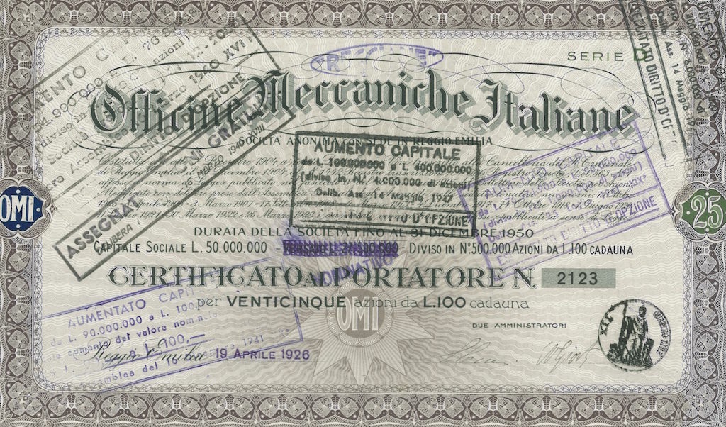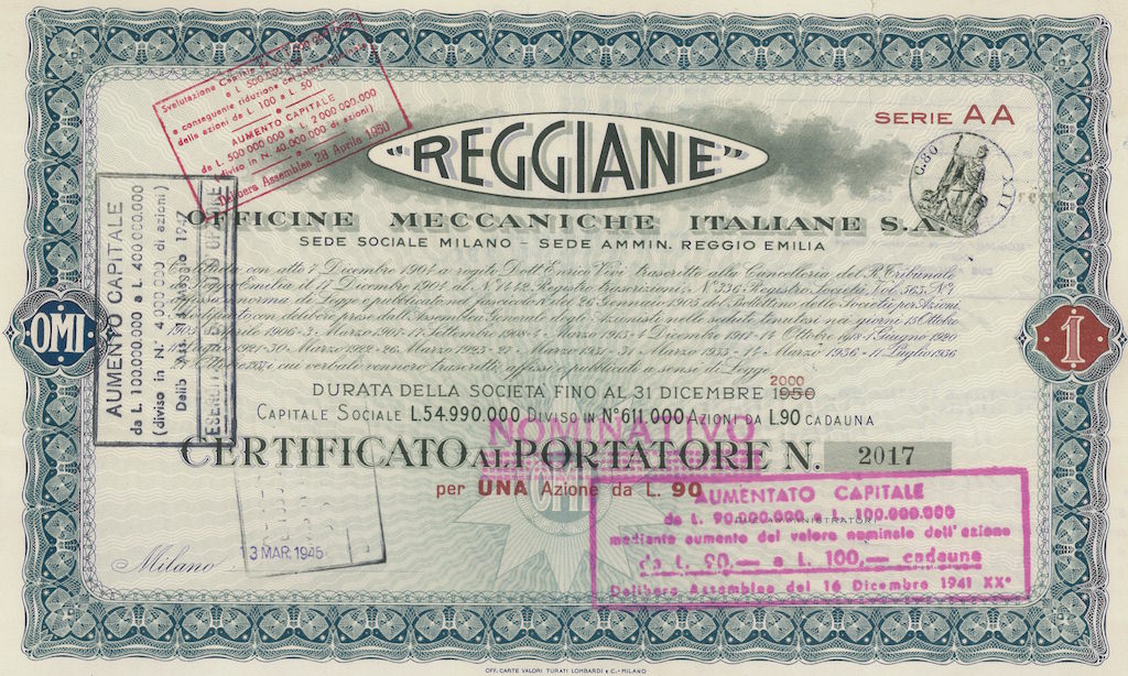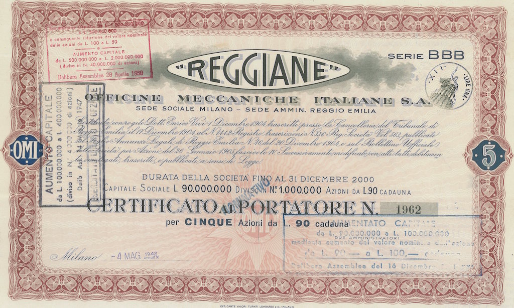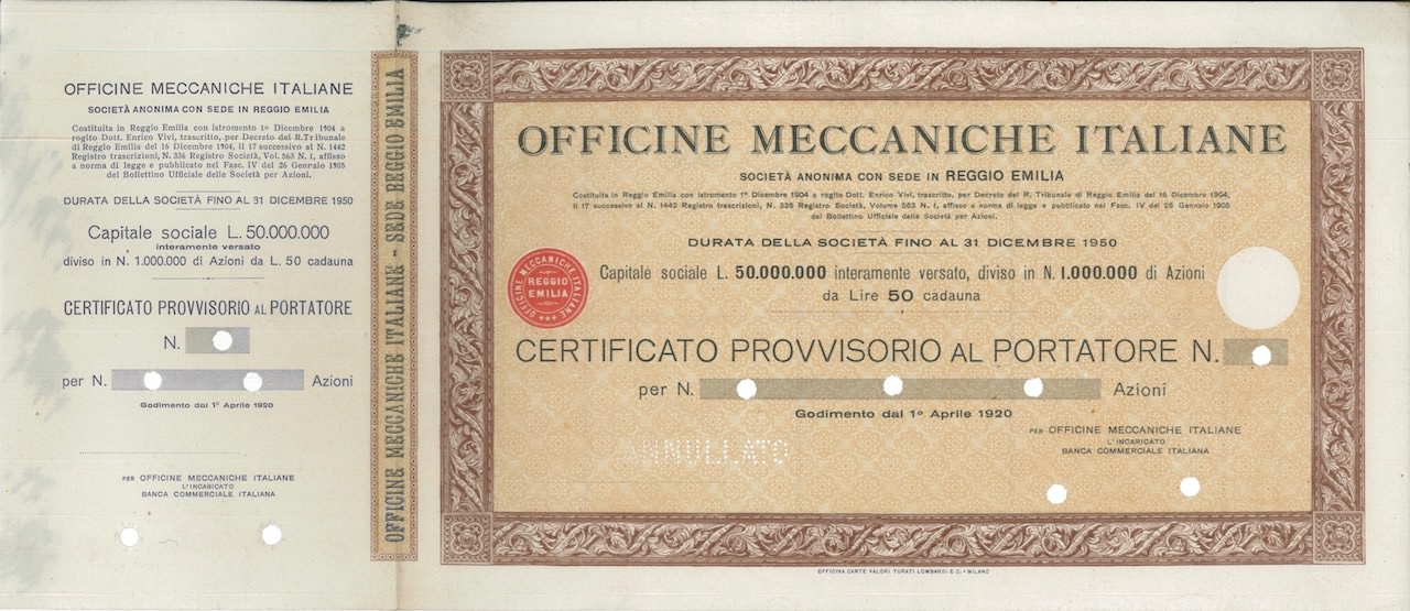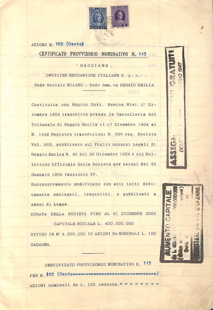 La crisi economica mondiale del 1930 mette definitivamente fine agli sforzi di salvare l’azienda (che intanto aveva giocato la carta delle macchine agricole). Nel 1933 l’Istituto per la Ricostruzione Industriale (I.R.I.) acquisisce la maggioranza azionaria consentendo il salvataggio almeno degli impianti di Reggio Emilia.