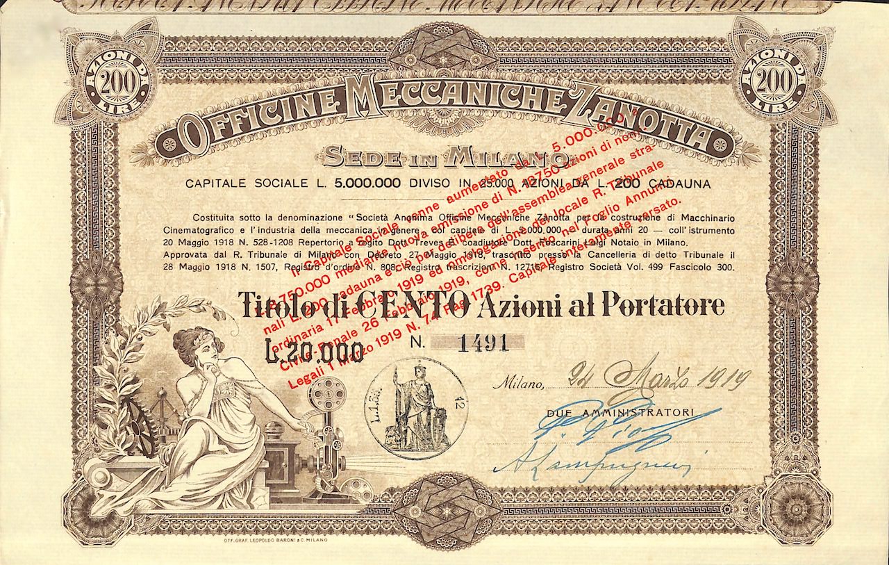 A-12238Officine Meccaniche Zanotta-1N.D.Milano1919100 azioni di fondazione da Lire 200R3 (501-1000 pezzi)S3 (da 51 a 100 €)