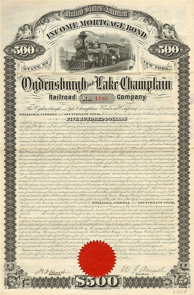 Classico “bond” ferroviario americano: nel campo superiore puttini ammiccanti ad uno “spaccato” di vita in stazione, con treno in sosta e viaggiatori in abiti dell’epoca. In basso sigillo rosso di carta con impresso il timbro a secco della compagnia, fondata nel 1849 come Northern Railroad per creare un collegamento ferroviario tra Ogdensburgh, nello Stato di New York, ed il lago Champlain, nel Vermont al confine con la provincia canadese del Quebec. Il cambio di denominazione avvenne nel 1861.