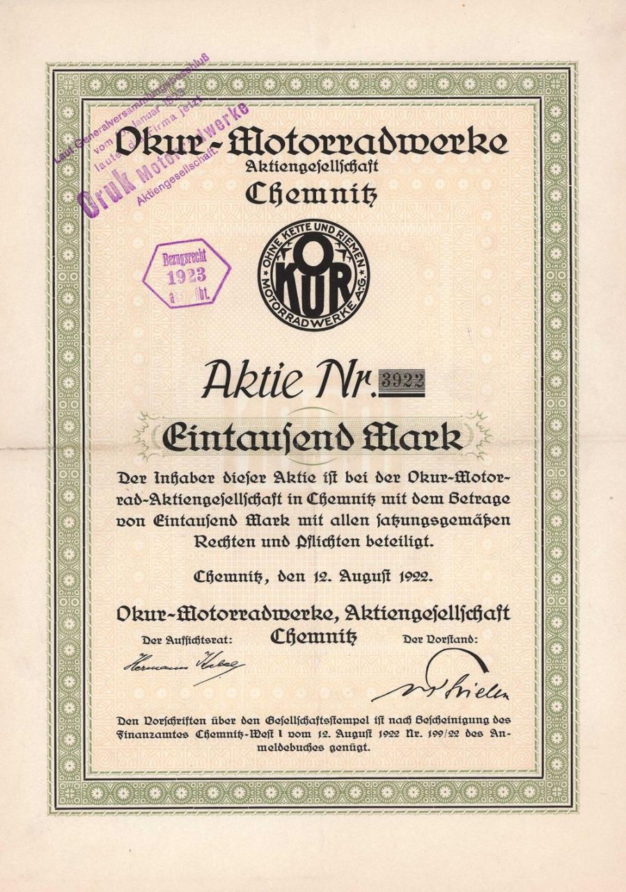 Fondata il 6 maggio 1922, registrata il 19 agosto 1922. Tutti i brevetti e i diritti di proprietà della motocicletta progettata dall’ingegnere Fritz Hayn, Erfenschlag, furono acquisiti, così come la produzione e la vendita di questa motocicletta, nonché la costruzione di tutti i tipi di veicoli a motore. Fino al 15 gennaio 1922 la società si chiamava Okur-Motorradwerke (“senza Catena e cintura “), quindi Oruk-Motorradwerke (” senza cintura e catena “). Nel 1924 la proprietà passò alla “Fahrzeug-Motoren-AG” di Dresda.