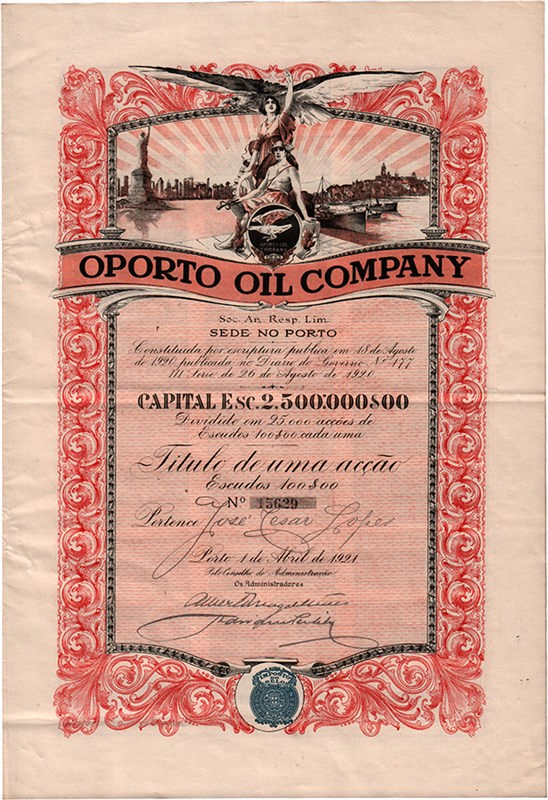 Magnifico ornato impreziosito da fregi, ampia veduta panoramica della città portoghese sul fiume Douro, poco lontano dall’Oceano Atlantico, e significativo marchio della compagnia con le divinità dell’Industria e del Commercio e l’aquila ad ali spiegate. Fra le principali industrie del Portogallo si possono senz’altro annoverare le raffinerie di petrolio.