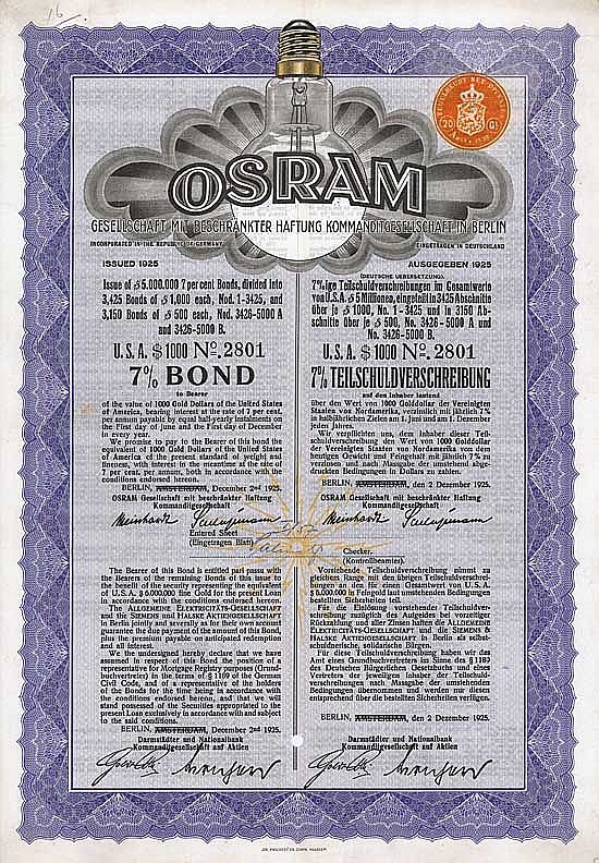 L’illuminazione a gas si accese intorno al 1826. Nel 1886 il chimico e ingegnere austriaco Auer von Welsbach inventò la lampada a gas a incandescenza. Nel 1901 l’Auergesellschaft ha presentato lampade a incandescenza con filamenti di osmio. Siemens & Halske aveva già completato con successo lo sviluppo di una lampada a incandescenza con filamenti di carbonio nel 1880 e ha aperto la più antica fabbrica tedesca di lampade a incandescenza nel 1882. Il marchio OSRAM è stato originariamente registrato da Auergesellschaft nel 1906. È una parola artificiale proveniente dai materiali filamentosi incandescenti precedentemente comuni OSmium e WolfRAM. Il 1 ° luglio 1919, Siemens & Halske, AEG e Auergesellschaft unirono la loro produzione di lampade a incandescenza nella neonata OSRAM GmbH KG. Siemens è l’unico azionista dal 1978; la società ha sede a Monaco. Oggi OSRAM ha 43.500 dipendenti in 46 stabilimenti (distribuiti in 17 paesi nel mondo) e un fatturato annuo di 4,6 miliardi di euro.