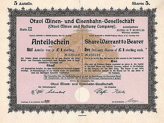 L’origine è la South West Africa Company, fondata a Londra nel 1892 da investitori tedeschi e inglesi e alla quale furono assegnate le concessioni. Nel 1900 fu fondata la Otavi Mining and Railway Company per sviluppare i giacimenti di rame e piombo vicino a Tsumeb nell’Otavi Bergland nell’Africa sud-occidentale tedesca. Da qui è stata costruita una ferrovia lunga 578 km con scartamento 600 mm per Swakopmund, nonché la costruzione di importanti impianti di fusione e la gestione di un’azienda agricola di 235.000 ettari. La ferrovia fu rilevata dall’impero tedesco nel 1910 dopo le enormi scoperte di diamanti nella colonia tedesca del sud-ovest. Il funzionamento delle miniere e degli smelter fu interrotto nel 1940 dalla seconda guerra mondiale. Nel 1945 tutte le proprietà furono confiscate e vendute dal gestore della proprietà ostile a Pretoria. Nel 1949 trasferimento a Francoforte sul Meno, altrimenti l’azienda era inattiva. Nel 1955 si ottenne un modesto nuovo inizio con la ricostruzione di una miniera di platino in disuso nel Transvaal orientale. A poco a poco, Otavi ha sviluppato attività in Germania e Sud Africa nei settori dei metalli rari, della ceramica da costruzione, nonché dell’isolamento e dei coadiuvanti di filtraggio. Lo stabilimento di Neu-Isenburg è diventato il più grande produttore di germanio. In totale, Otavi ora impiegava di nuovo più di 1.300 persone, il principale azionista era Kupferhütte Norddeutsche Affinerie, Amburgo. Nel 1976 conversione da azienda coloniale a AG (Otavi Minen AG), nel 1987 trasferimento a Eschborn. Fu l’ultima delle prime società coloniali ad essere quotata in borsa fino a dopo la fine del millennio. Nel 1998 la Greek Silver & Baryte Ores Mining Co. ha acquisito la maggioranza delle azioni e ha incorporato completamente Otavi nel 2003/04. L’ex Otavibahn è ancora in funzione oggi, ma da allora è stato reindirizzato allo scartamento Cape e fa parte di TransNamib, la compagnia ferroviaria statale della Namibia.