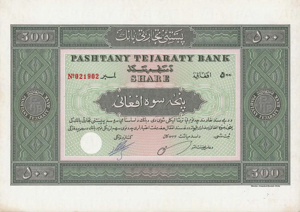 Dal 1907 Russia e Inghilterra avevano garantito congiuntamente l’indipendenza afgana, che divenne una monarchia costituzionale. Sebbene solo il 4% dell’area prevalentemente sterile sia utilizzata per l’agricoltura, l’agricoltura fornisce il 70% del reddito nazionale – l’Afghanistan era ed è uno dei paesi più arretrati di tutto il mondo. Fu solo nel 1956 e nel 1962 che due piani quinquennali tentarono di modernizzare l’economia – questo portò anche all’emissione di questa quota, l’unica sicurezza conosciuta dall’Afghanistan ad oggi. La “Rivoluzione d’aprile” del 1978 ha rovesciato il presidente Daoud, che ha fatto perdere il potere all’ultimo re Zahir Shah nel 1973 con un colpo di stato. Sfortunatamente, sappiamo fin troppo bene ciò che è seguito: governi comunisti fedeli a Mosca, guerra civile, talebani.