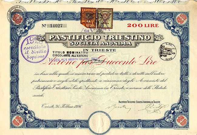 Fondata nel 1908 come “Pastificio Triestino società per azioni”, esportava soprattutto nei paesi orientali, nel golfo persico ed in Australia. Tra i clienti del Pastificio vi era inoltre l’esercito e le compagnie de viaggio del Lloyd e l’Austro americana.
