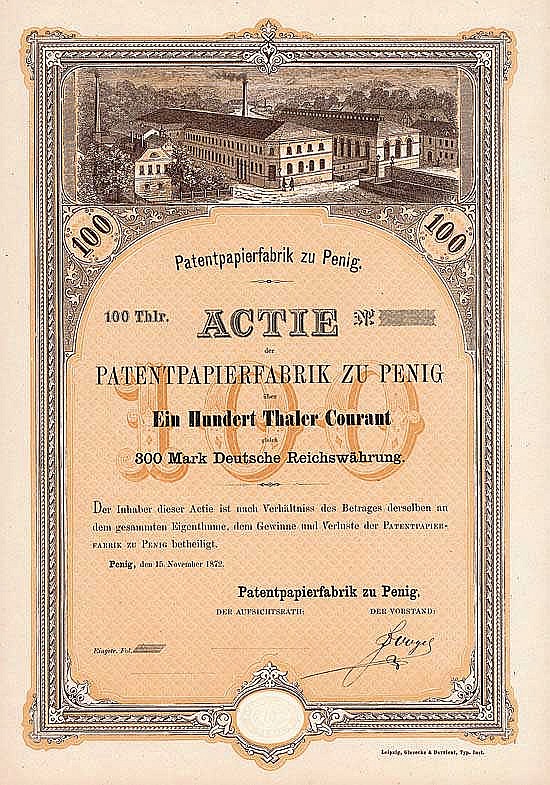 Fondata nel 1872. La cartiera risale al 1537. Tra i fondatori dell’AG vi è Rud. Brockhaus, Lipsia (membro del consiglio di sorveglianza). La più grande cartiera della Sassonia all’epoca. L’AG ha rilevato la fabbrica di carta, paglia e gas di Ferd. Flinsch. Possedeva altre cartiere a Reisewitz e Wilischthal / Zschopau, un impianto di smistamento stracci a Geithain e una cartiera di pasta di legno a Selva. Rappresentata più di recente nell’AR: Aschaffenburger Zellstoffwerke AG, Dresdner Bank e ADCA. Quotazione in borsa a Dresda, poi Lipsia. La cartiera è ora una fabbrica di Technocell Dekor, una controllata al 100% del gruppo Felix Schoeller con una holding a Osnabrück. Solo carte speciali ad alta tecnologia vengono utilizzate per la finitura superficiale di materiali a base di legno, ad es. Truciolare e fibra di legno prodotti e forniti in tutto il mondo.
