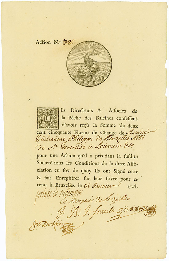 La Whaling Association fu fondata nel 1728 per la durata di 15 anni a causa della concessione decretata dall’imperatore Carlo VI nel 1727. Secondo lo statuto la capitale di base era di 212.500 doratori. Fu diviso in 850 azioni a 250 doratori ciascuna. Il capitale nominale è stato trasportato da nove soci. Il barone Adam Joseph de Sotelet era il maggiore azionista e la personalità di spicco dell’azienda. Comprò cinque navi baleniere, compresi gli equipaggi di San Sebastian, nel nord della Spagna, vi lasciò due navi e ne posizionò le altre tre nel porto di Oostende [Belgio]. Con tutte e cinque le navi la compagnia persegue il redditizio business della caccia alle balene nel territorio tra Groenlandia e Spitsbergen. Questo magnifico titolo secolare porta le firme originali del fondatore: Prince de Rubompre, Marchese d’Herzelles, President de Fraula, A. Walhorn du Decker e Henry v. Meygelen.
