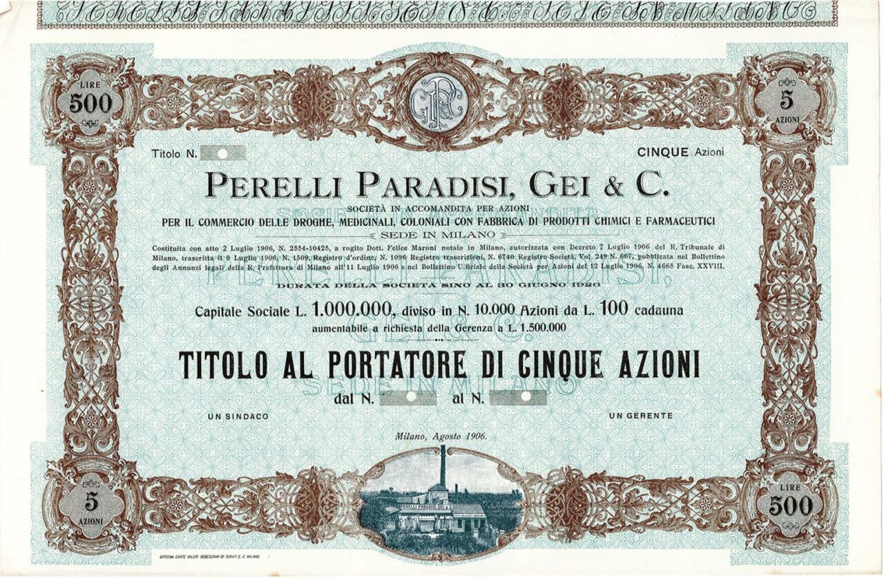 B-85103Perelli Paradisi, Gei & C. per il comm. delle droghe, medicinali, coloniali con fabbrica di prodotti chimici farmaceutici-2Milano19065 Azioni al portatore da Lire 100R2 (1001-5000 pezzi)S2 (da 26 a 50 €)