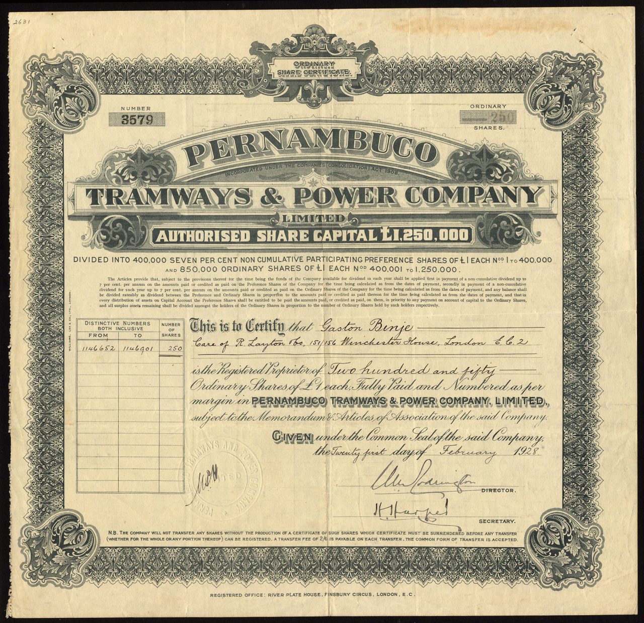 Registrato nel 1913.. Numero società 126731