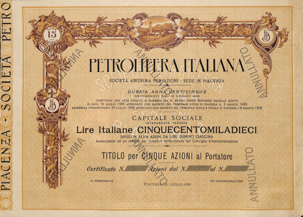 La SPI viene fondata il 16 luglio 1905 da un ristretto numero di azionisti, guidati dal cav. Luigi Scotti, mitica figura di pioniere del petrolio. Già nel 1911 la Società riesce a ottenere la concessione della Miniera di Vallezza.