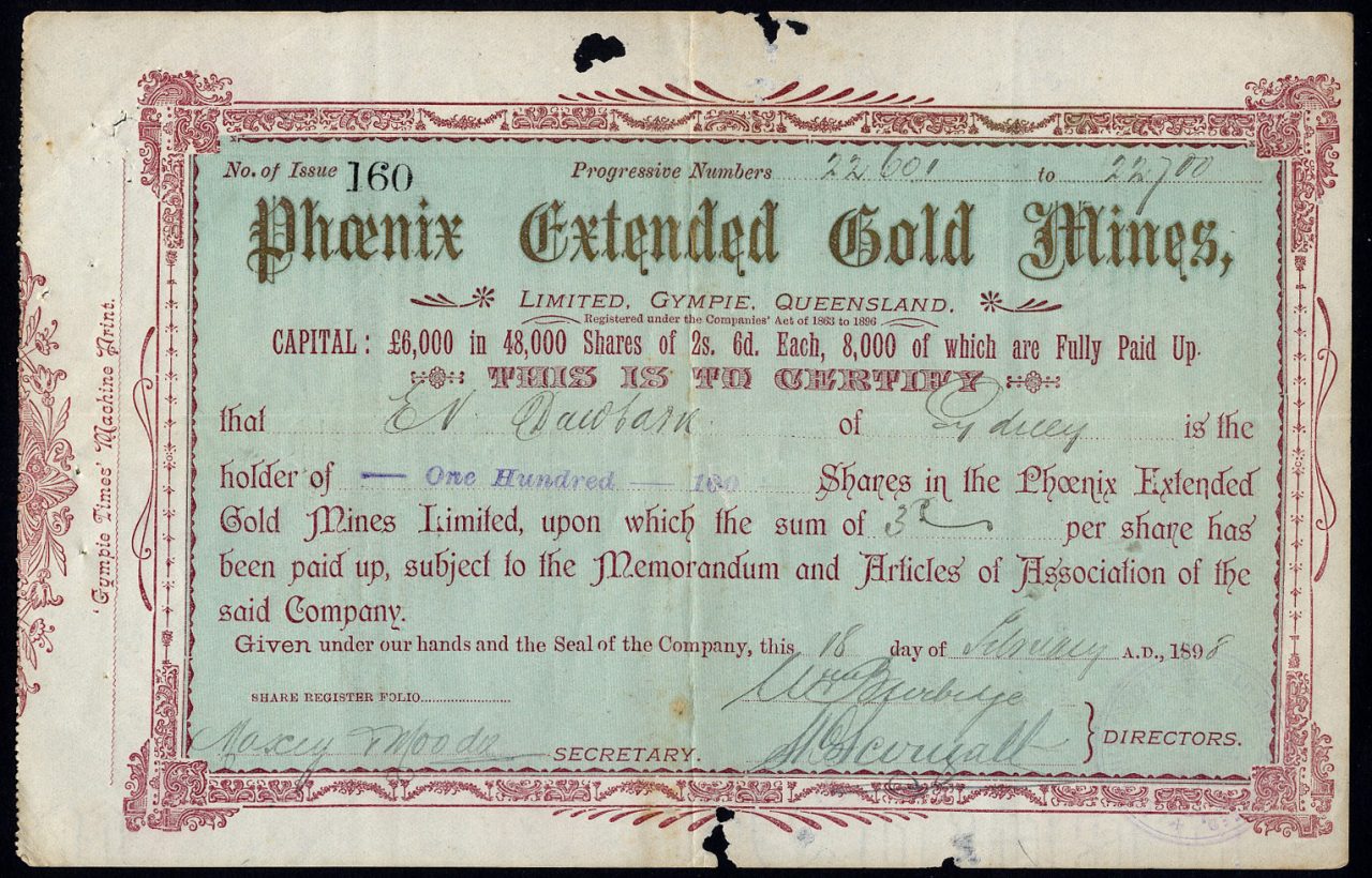 Registrato nel Queensland. Miniere a Gympie.