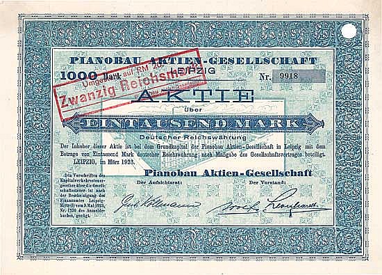Fondata nel 1921, produzione di pianoforti e strumenti musicali. Le operazioni di produzione furono interrotte a causa della crisi economica globale nel 1932 e poi la società fu ribattezzata Grundstücks-AG Gohlis. La società possedeva un complesso immobiliare a Lipsia-Gohlis, che consisteva in diversi edifici residenziali di quattro piani e un edificio industriale più grande di quattro piani. Anche gli edifici della fabbrica furono trasformati in edifici residenziali nel 1932. C'erano anche un'autofficina e un garage di proprietà. Maggiore azionista (1943): Glückauf Siedlungs-GmbH, Lauchhammer (95%).