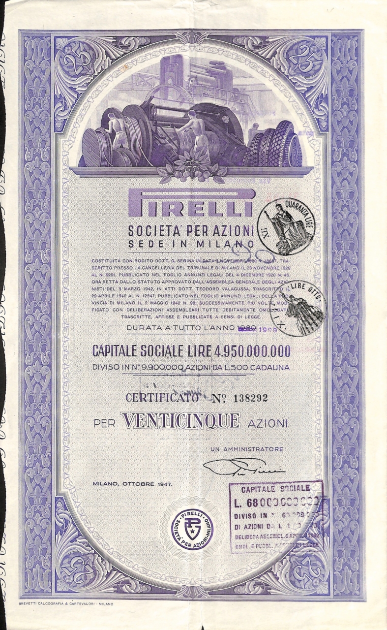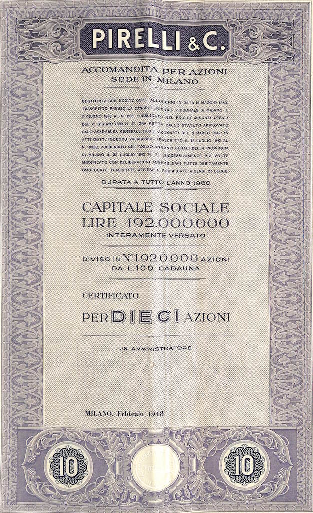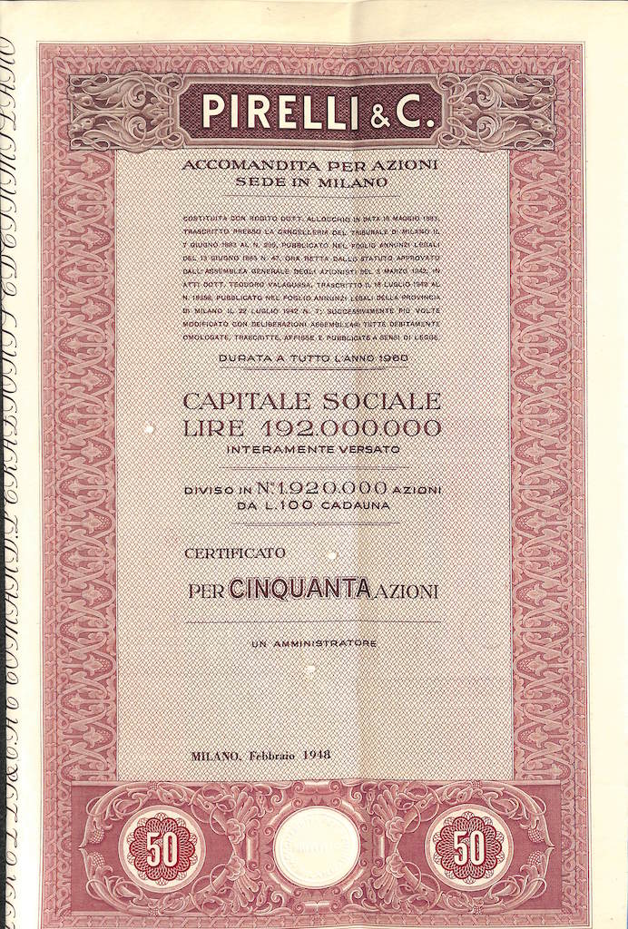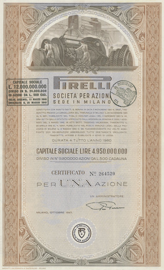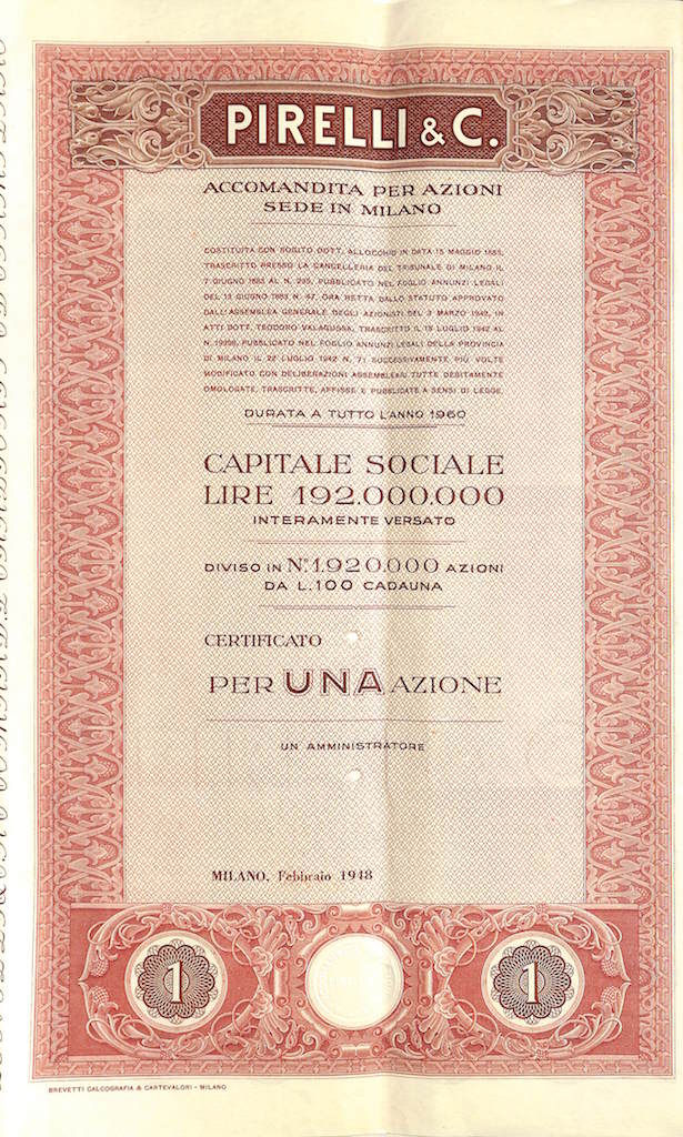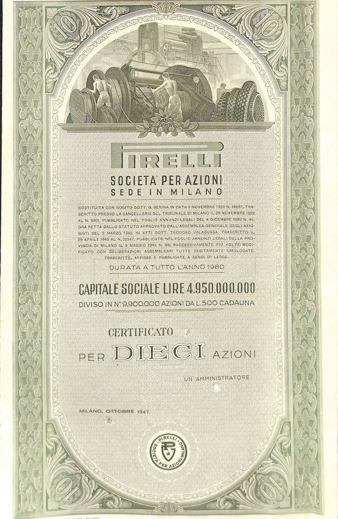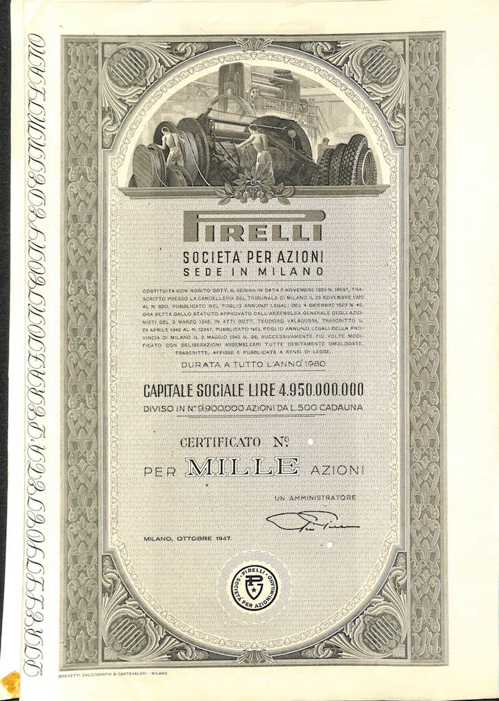 La “Pirelli & C.” fu fondata a Milano nel 1872 dall’ingegnere Giovanni Battista Pirelli, allo scopo di produrre “articoli tecnici” di caucciù vulcanizzato. Sostanzialmente si trattava di tele gommate, cinghie di trasmissione, manicotti e raccorderie in gomma.