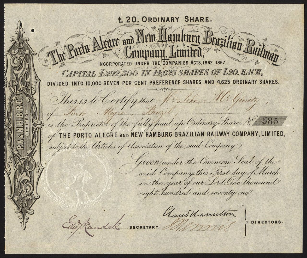 A-33664Porto Alegre and New Hamburg Brazilian Railway Company Ltd-1Brasile18711 ordinary shareR2 (1001-5000 pezzi)S2 (da 26 a 50 €)