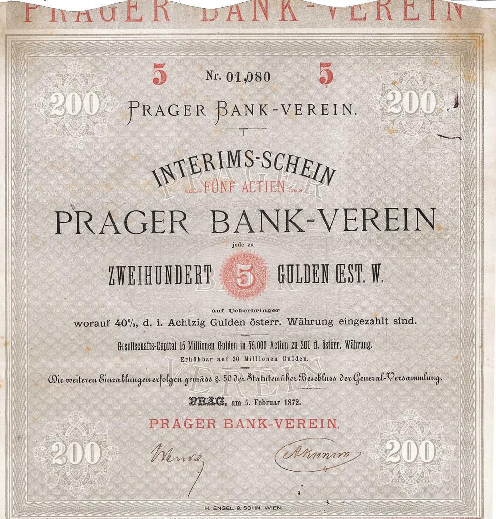La banca, con sede a Praga, Graben 33, era un prodotto tipico dei primi tempi: lanciata con grande pompa alla Borsa di Vienna, le azioni erano inizialmente quotate al 136%, ben al di sopra della parità – un dividendo pagato per il primo esercizio non inferiore a 16 % ha scosso gli investitori in sicurezza. Un anno dopo, quando le calamità divennero evidenti, il prezzo scese al 36%. Una riduzione del capitale dagli originali 15 milioni a 2,4 milioni di fiorini non era ancora sufficiente per compensare le immense perdite: alla fine del 1876 le azioni non erano più quotate.