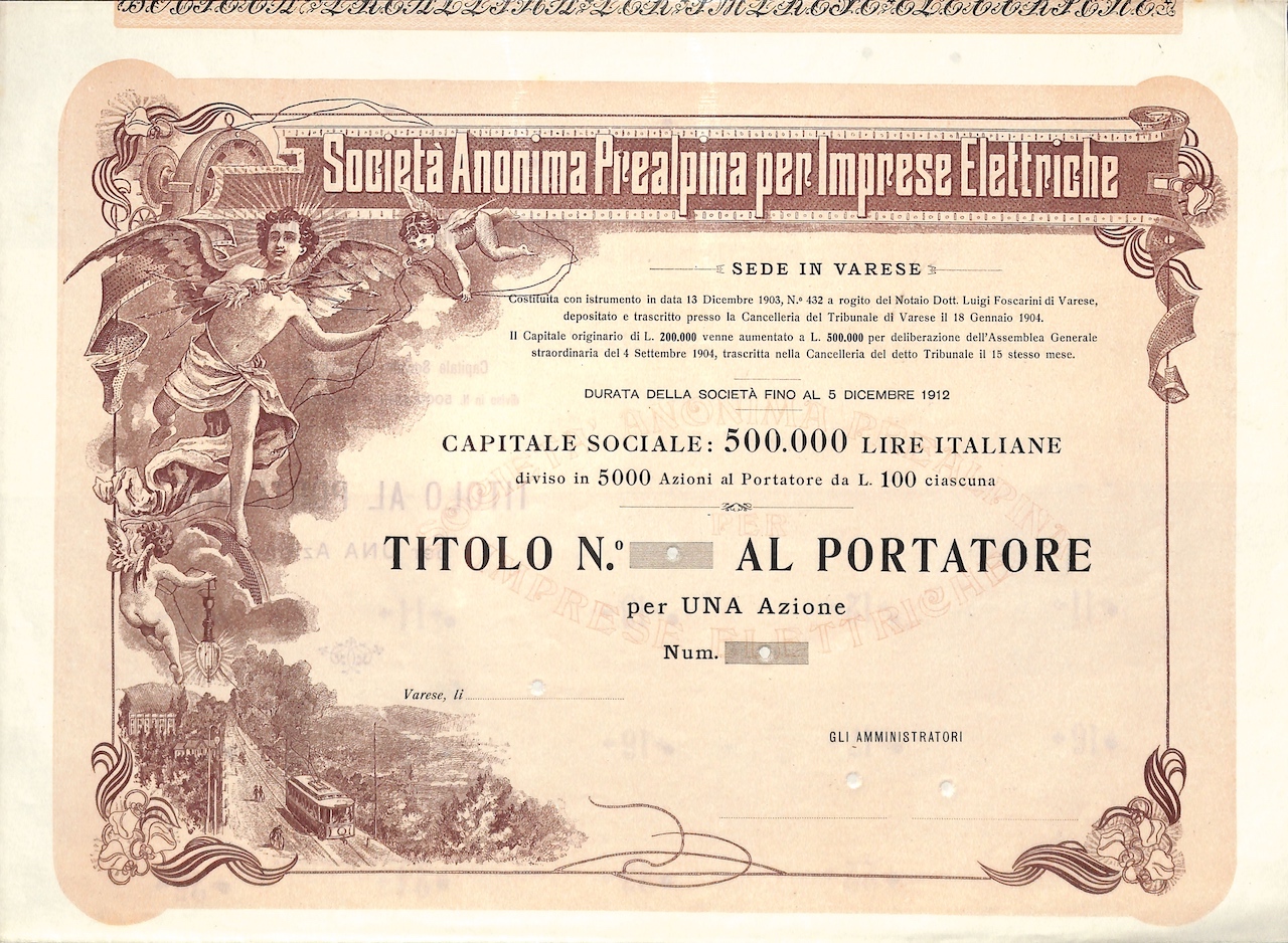 A-7436Prealpina per Imprese Elettriche Soc. An.-1N.D.Varese19031 azioneR3 (501-1000 pezzi)S2 (da 26 a 50 €)