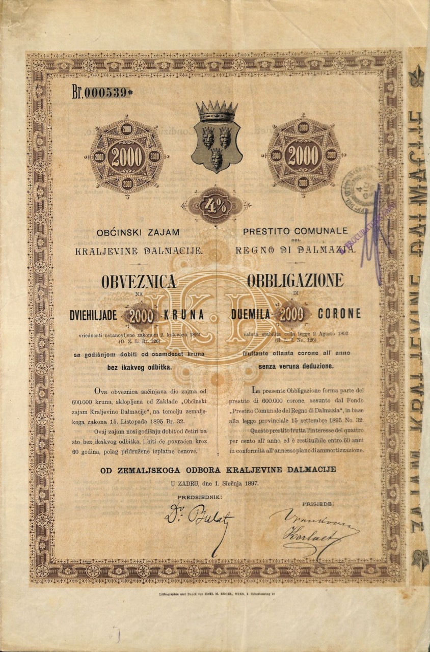 Lithographie und Druck von Emil M. Engel di Vienna. 26x39,5 cm. Testo in italiano e croato. Stemma del Regno di Dalmazia, all’epoca facente parte dell’Impero Austro-Ungarico.