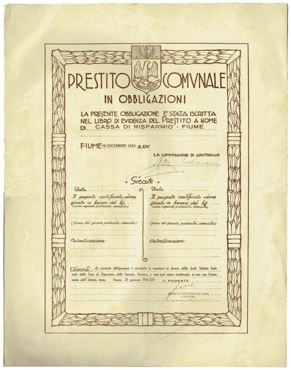Prestito Comunale in Obbligazioni Fiume