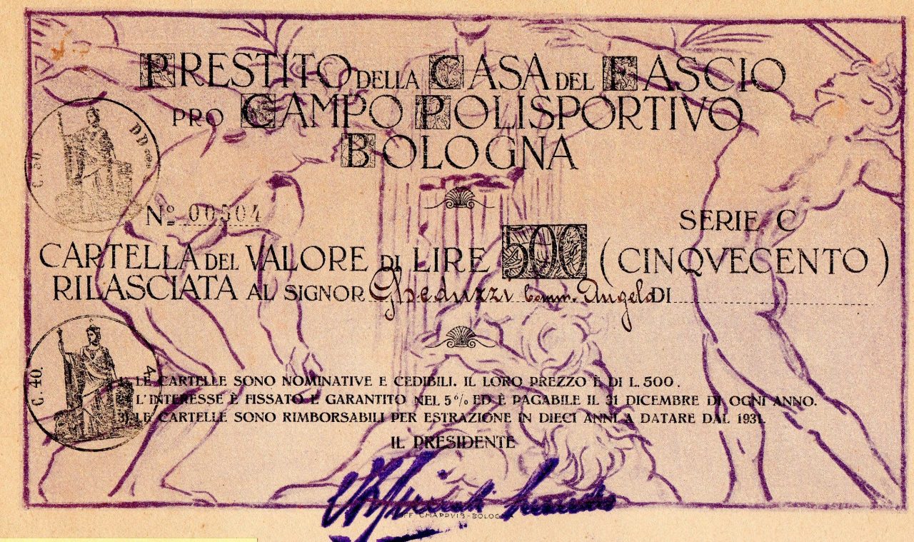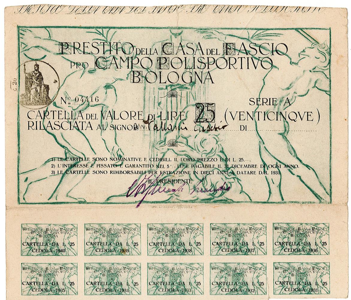 Stampata dal rinomato stabilimento litografico del Dott. Edmondo Chappuis, di origine svizzera: il suo atelier, nel centro storico bolognese, riuniva giovani artisti particolarmente abili nell’esecuzione di manifesti ispirati all’estetica Liberty, destinati a diventare molto famosi – come Dudovich, De Carolis, Metlicovitz, Terzi, Cambellotti e altri – rappresentando un nucleo di diffusione di concetti artistici innovativi, punto di riferimento nel clima culturale cittadino dell’epoca. 22×13 cm. Tipica grafica del periodo fascista con immagine di atleti sullo sfondo, ispirata a motivi della romanità. Nel 1925 la società anonima bolognese – sostenuta dal Partito Nazionale Fascista, in particolare nella persona del vicesegretario generale poi podestà cittadino Leandro Arpinati (1892-1945, firma autografa sul certificato come presidente) – si rese promotrice, anche mediante la raccolta di fondi tra i cittadini, della realizzazione del campo polisportivo, denominato Stadio del Littoriale e successi-vamente Stadio Comunale, ove la squadra calcistica del Bologna disputa dal 1927 le sue gare interne. Il primo progetto, comprensivo dei campi per il gioco del calcio e del tennis nonché della piscina aperta e coperta, fu affidato all’ingegner Umberto Costanzini (1897-1968). Dal 1983 lo stadio bolognese ha cambiato denominazione in Stadio Renato Dallara, intitolato alla memoria dell’amato presidente storico che diresse il Bologna nel trentennio 1934-1964.