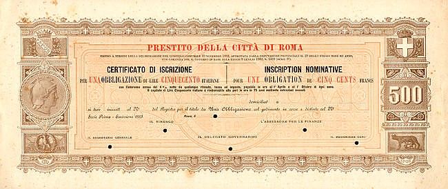 Elaborata cornice con stemmi di Roma e del Regno d'Italia che si avvicendano, effige di Roma elmata, lupa capitolina con i gemelli.