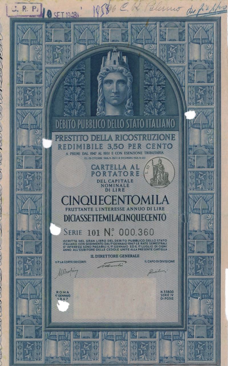 K-15423Prestito della Ricostruzione Redim. 3,50% – Cartella al Port. (1947)-11Roma1947500000 lireBluR4 (251-500 pezzi)S4 (da 101 a 250 €)