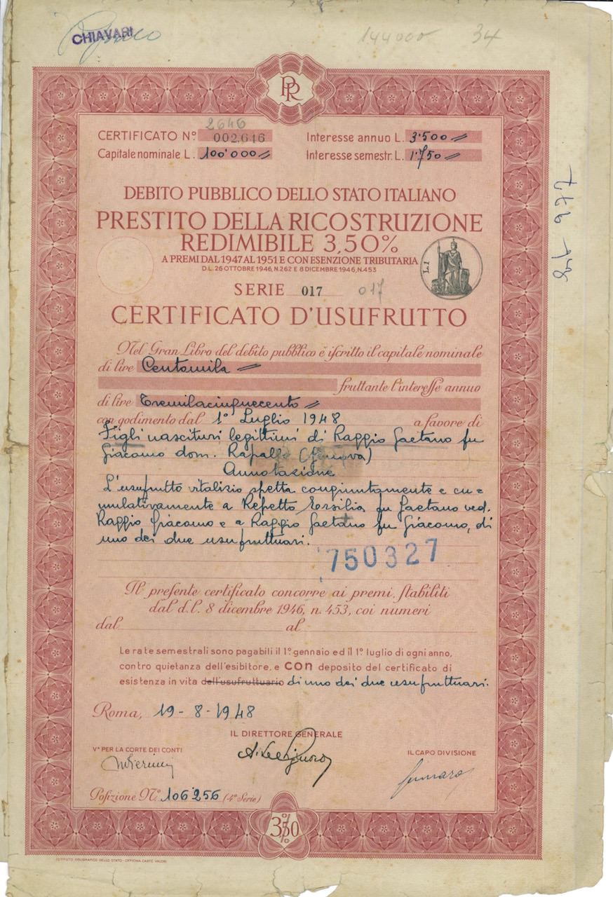 A-15405Prestito della Ricostruzione Redim. 3,50% (a Premi) – Cert. d’Usufrutto-1Roma1948VariabileRosaR2 (1001-5000 pezzi)S2 (da 26 a 50 €)