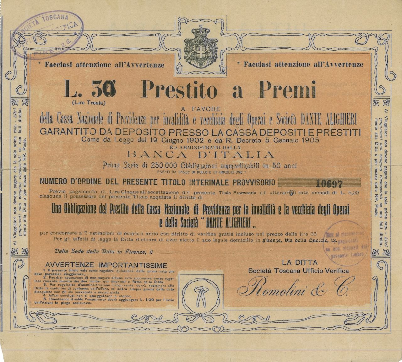 A-16975Prestito a Premi a Fav. della Cassa Naz. di Prev. e Soc. Dante Alighieri-1Firenze19021 obbligazioneBeigeR3 (501-1000 pezzi)S3 (da 51 a 100 €)