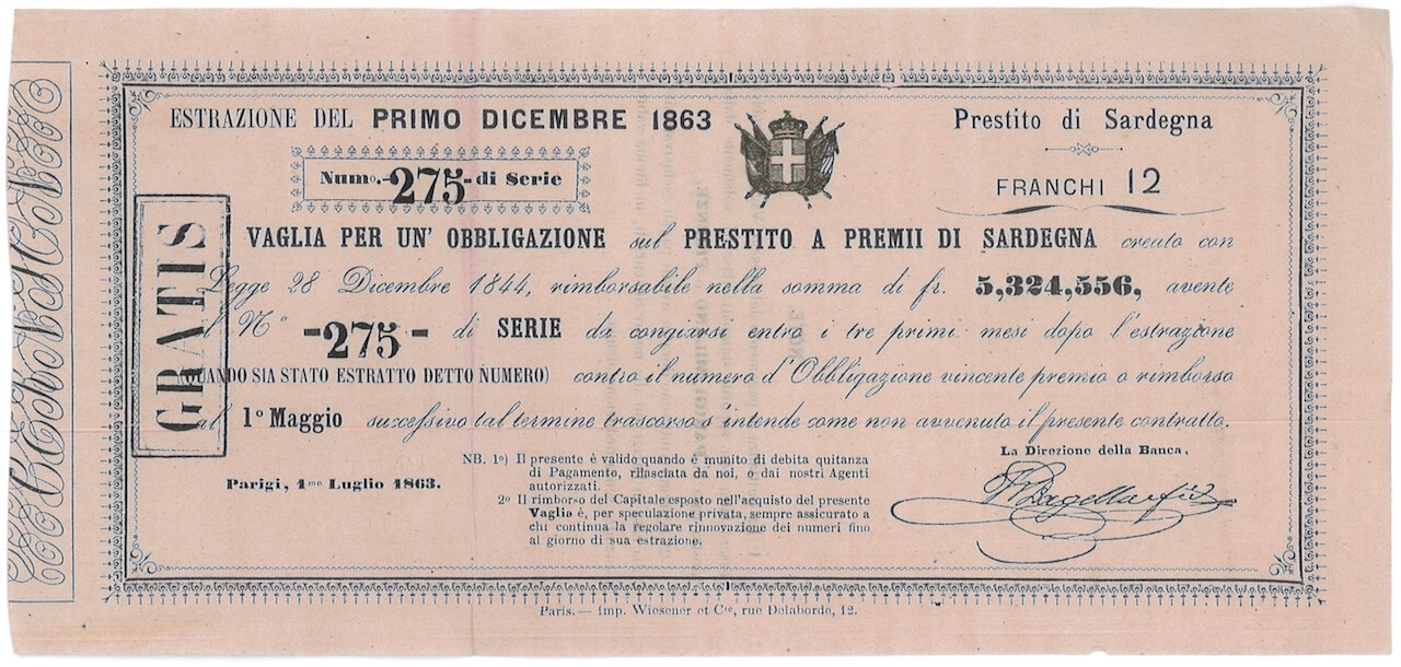 A-29303Prestito a Premii di Sardegna-1Stamperia Wiesener, ParisParigi18631 obbligazioneR3 (501-1000 pezzi)S3 (da 51 a 100 €)